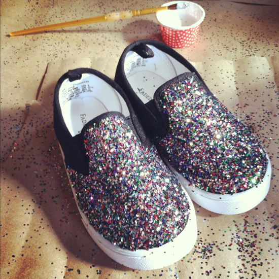 I knew I wouldn’t ever wear glitter shoes, I’m a sneakers type of girl, but I KNEW CT would love them! So we got a cheap pair of black slip-ons and headed over.